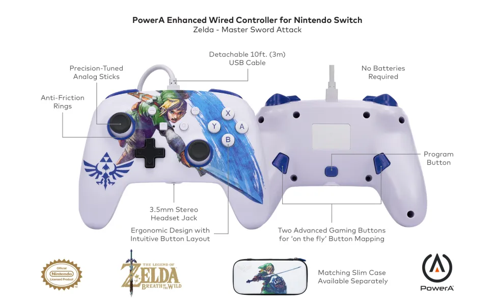Slash through legions of enemies with the legendary Master Sword when you pick up this beautiful controller featuring The Legend of Zelda’s Link. This Enhanced Wired controller features the iconic savior of Hyrule, as well as awesome gaming features that improve every hero’s journey. Program two mappable Advanced Gaming Buttons on-the-fly, feel the comfortable ergonomic design as you play for hours, plug in your headset for stereo sound, and enjoy smooth thumbstick control thanks to a pair of embedded anti-friction rings. Includes a 10ft (3m) USB cable