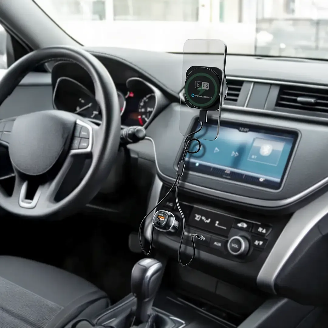 The Powerology Nexar Smart Car Charger, which comes in black, is a state-of-the-art charger that caters perfectly to your power needs during the journey. The charger output of 51W gives a wide variety of charging choices such as 18W USB-A, 30W cable, 33W PPS, and 15W for wireless charging, which is super-fast and efficient for your smartphone, tablet or any other device. Along with magnetic stability and a magnetic holder, this charger gets mounted on your car strongly and also secures your devices not to move during the drive. The Wireless CarPlay feature and CarPlay connectivity make it easy for you to have your car’s sound system as your very own digital music library. Overloading protection system is a plus and gives peace of mind to your devices. The PD 30W gives super charging, and the 15W wireless provides the option of charging without the hassle of removing the charging cable. This is a charger for those needing quick, efficient, and flexible charging while traveling.