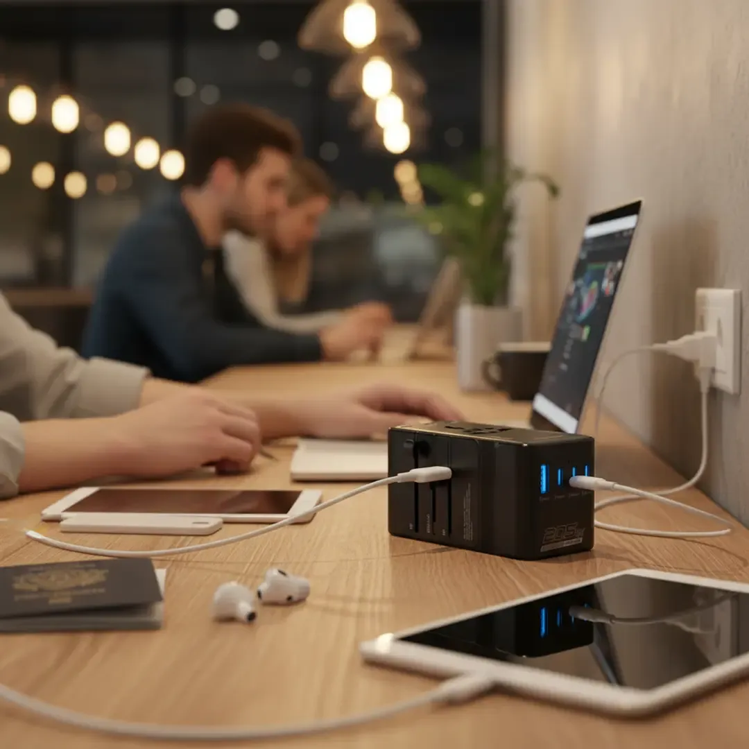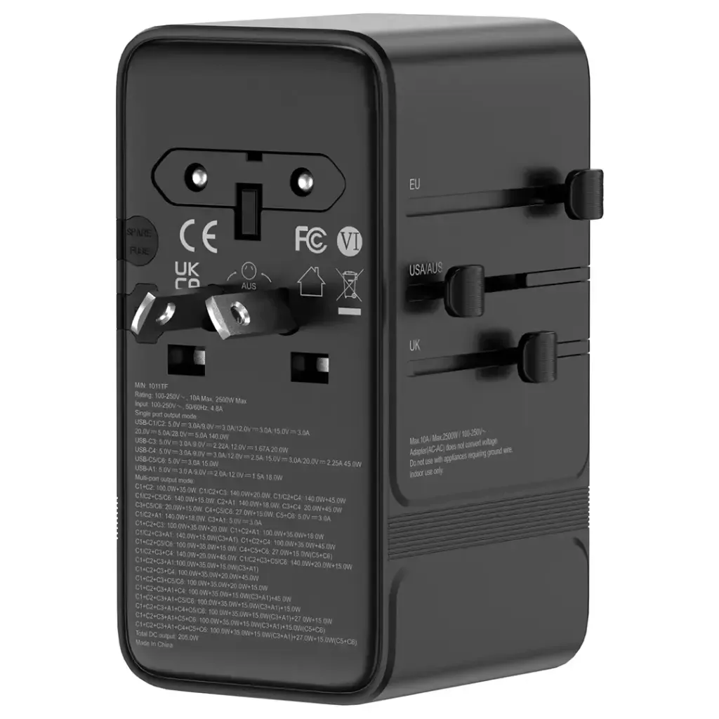 The Powerology Spetrova GaN Multi-Port Universal Adapter in Black not only provides an outstanding charging solution but also effortlessly powers different devices all at once. The GaN III efficiency that it uses guarantees extremely fast charging, together with a smaller and more heat-resistant design. The adapter is very versatile, as it lets you charge 7 devices at once, thanks to the available x1 USB-A and x6 USB-C ports, which provide different outputs for the various devices. The PD 140W power makes it possible to charge the most power-hungry devices in no time at all. The maximum total rated power of 2500W and a maximum current of 10A ensure that the power distributed is reliable and safe. The adapter gives several output combinations, such as USB-C1 and USB-C2 with 140W max each, and USB-C3 and USB-C4 with 45W max and 20W max outputs, respectively. It supports a wide range of plug types, including USA, AU, UK, and EU, making it suitable for international travel.