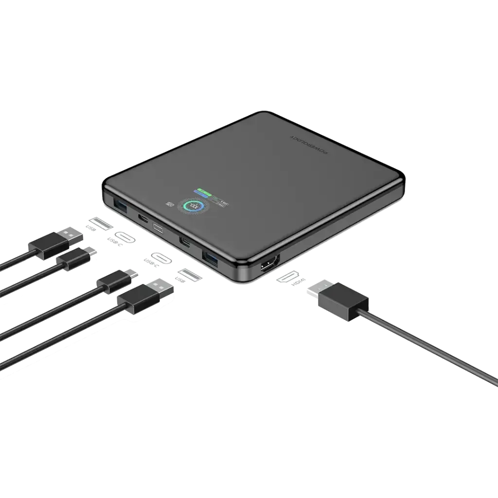 Powerology Voltstream 20000mah Power Bank – Black Provides Perfect Portable Charging For Your Devices. With A Max 100w Output, Fast Charging Is Ensured With Dual Usb-c Ports (Up To 65w Each) And A Usb-a Charging Port. Another Feature Of This Power Bank Is That It Comes With An Hdmi Output That Supports 4k Video To Help Elevate Your Entertainment Experience. Be It Smartphones, Tablets, Or Laptops: This Bank Can Charge Them All. Thanks To The Massive 20000mah Capacity, Multiple Recharges Can Be Made, While The Smart Power Display Keeps You Updated On The Remaining Charge. Carry It Everywhere, Especially With Usb-a2 For Data Transfer Support. If You Ever Need To Charge On The Go Or Stream Content, The Voltstream Powers Through Quickly And Efficiently.