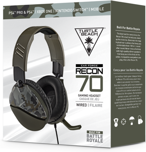 The Turtle Beach® Recon 70 Green Camo gaming headset features a lightweight and comfortable design, high-quality 40mm over-ear speakers, and a high-sensitivity flip-up mic.