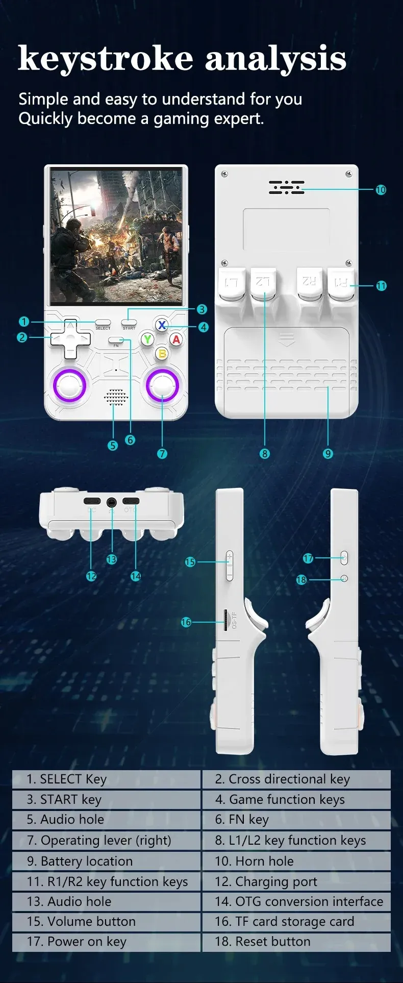 Pre-installed with 20+ classic emulators including PSP, PS1, N64, Dreamcast, CPS1/2/3, SFC, FC, GBA, GB, GBC, MD, GG, NeoGeo, NGP, and more.