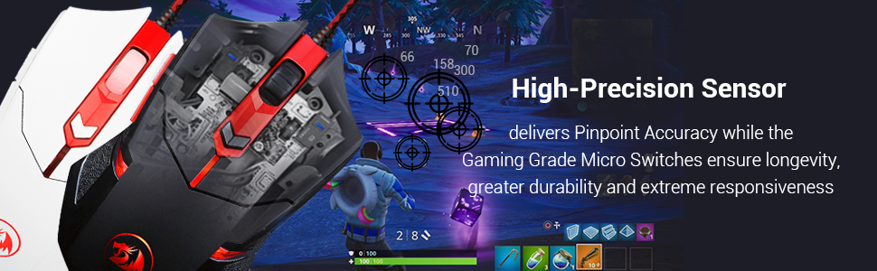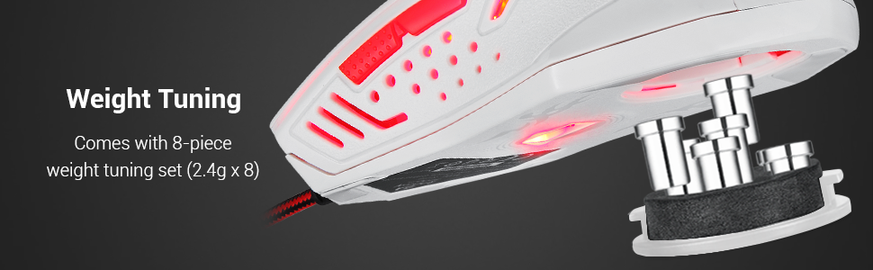 • WIRED GAMING MOUSE; Ergonomic Redragon RED Backlit Gaming Mouse up to 3200 DPI (user adjustable 800/1600/2400/3200 DPI), 30G acceleration and Weight Tuning set. Total 6 Buttons of which 5 are programmable. The High-Precision Sensor delivers Pinpoint Accuracy while the Gaming Grade Micro Switches ensure longevity, greater durability and extreme responsiveness, giving you an even greater edge over your competition