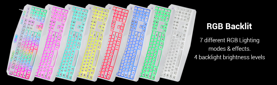 • RGB BACKLIT GAMING KEYBOARD; 7 different RGB Lighting modes & effects, 4 backlight brightness levels, adjustable breathing speed. The keycaps offering clear uniform backlighting WIN key can be disabled for gaming. The PC Gaming Keyboard has been ergonomically designed to be a superb typing tool for office work as well. The gaming Keyboard is built to withstand the average liquid spill. The integrated wrist rest gives you the comfort you need for marathon gaming sessions