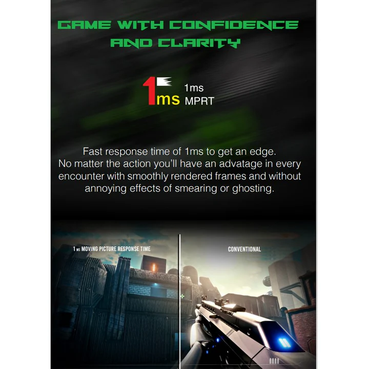 Fast response time of 1 ms to get an edge. No matter the action you’ll have an advantage in every encounter with smoothly rendered frames and without annoying effects of smearing or ghosting.