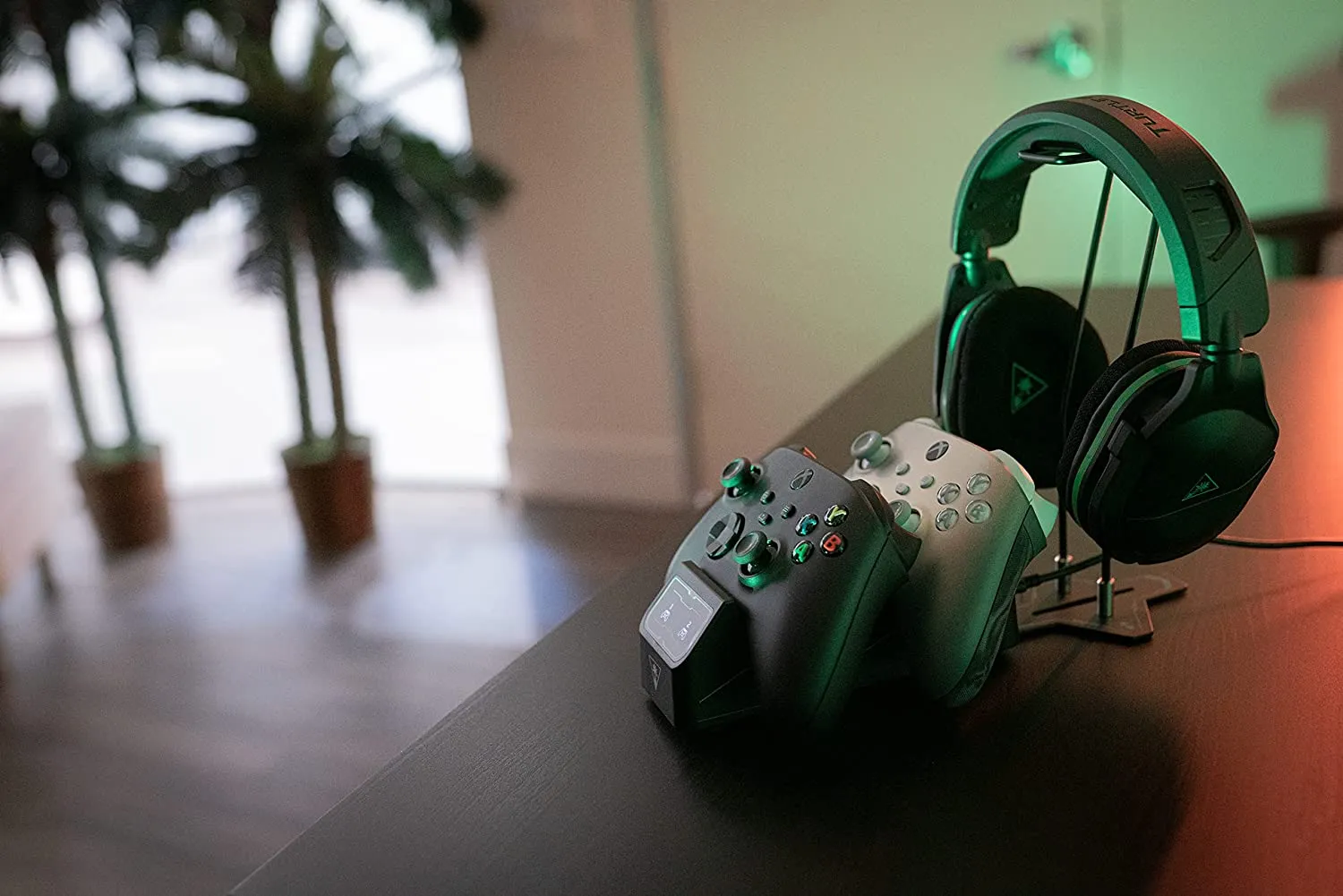 The Turtle Beach Fuel Dual Controller Charging Station & Headset Stand for Xbox Series X, Xbox Series S & Xbox One First-Party Wireless Controllers delivers reliable power for your controller and convenient headset storage. Two 1200mAh battery packs deliver 22+ hours of rechargeable power, plus you will never have to deal with the environmentally harmful, and frustrating AA batteries. When you do need to fuel up, simply drop your controller onto the charger, and in 2.5 hours you are back in action with a fully recharged battery. Keep an eye on the charge levels with easy-to-read battery level indicators, amber lights indicate the charge is in progress, and once the light turns white, you’re good to go. The compact footprint of the station, and 3′ / 1m cable length keeps your setup neat and manageable, regardless of where your gaming setup is located.