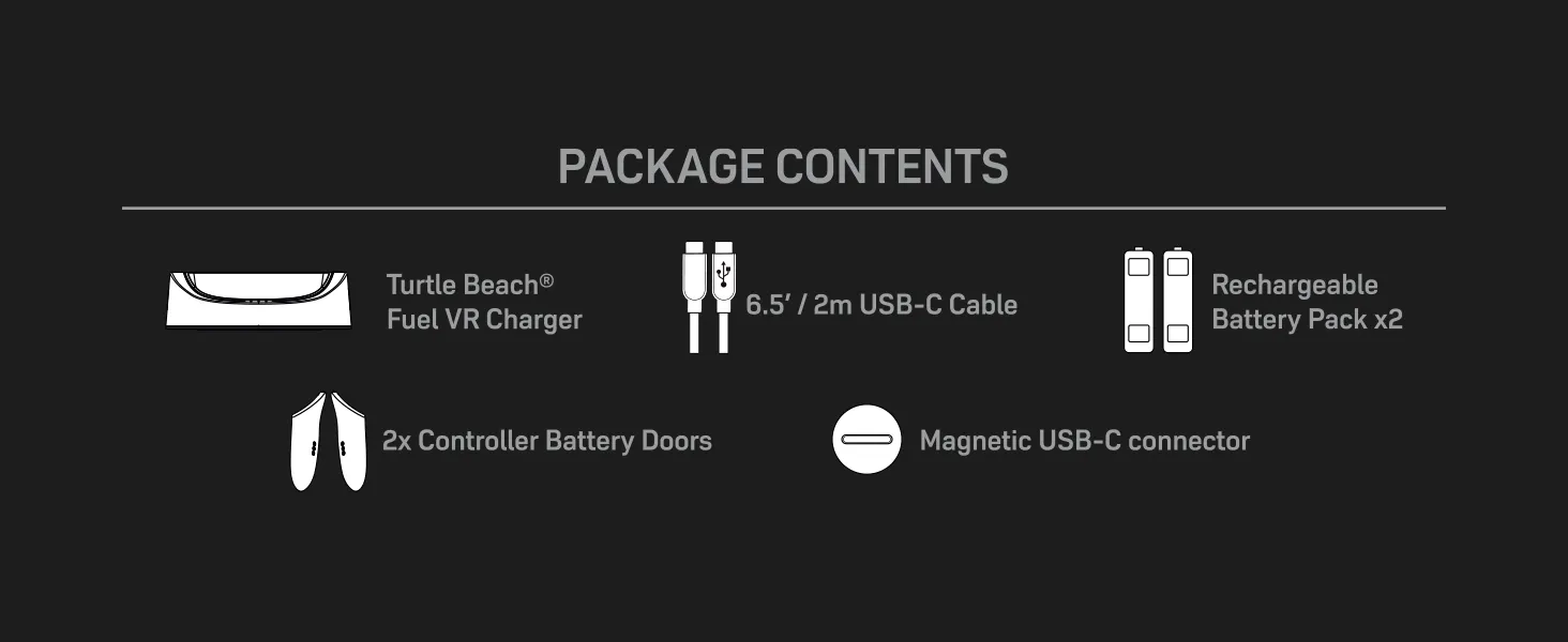 The Turtle Beach Fuel Compact VR Charging Station delivers reliable, rechargeable power for your Meta Quest 2 virtual reality headset and touch controllers. Two 1500mAh battery packs deliver 20-hours of rechargeable power each, and eliminate the need for environmentally harmful, disposable batteries. Slotted battery door covers on the controllers and included USB-C to magnetic pin dongle for headset make for easy magnetic charging. So, when you do need to fuel up, simply drop your headset and controllers onto the charger, and in 2.5 hours you are back in action with a fully recharged battery. Plus, the Fuel VR Charging Station support quick-charge capabilities when plugging the USB-C power cable into the Meta Quest 2 AC adapter. Keep an eye on the charge levels with easy-to-read battery level indicators, amber lights indicate the charge is in progress, and once the light turns green, you’re good to go. The compact footprint of the station, and 6.5ft / 2m cable length keeps your setup neat and manageable, regardless of where your VR setup is located.