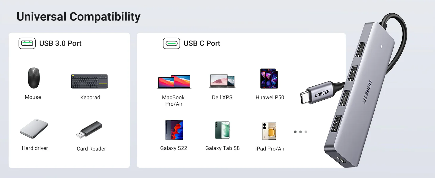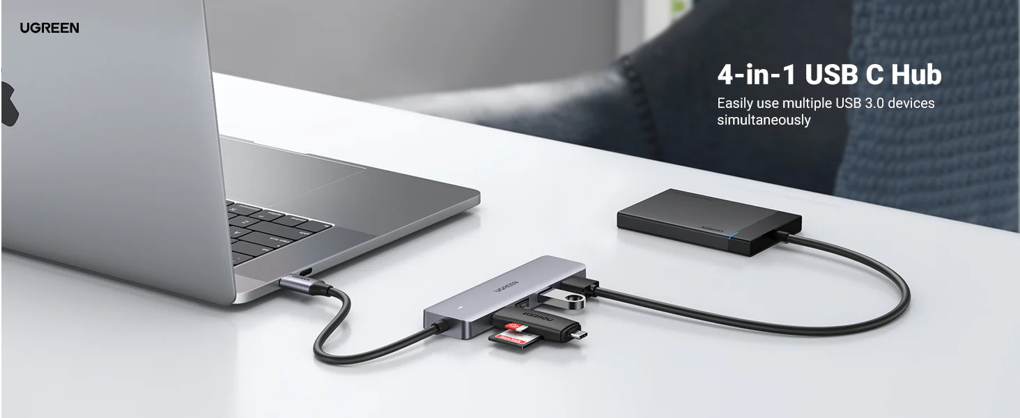 This USB-C slim hub adapter bridges the gap between USB-A and USB-C to connect older devices to your new USB C laptop, expand the single C type port or thunderbolt 3 into 4 standard USB 3.0 female ports.