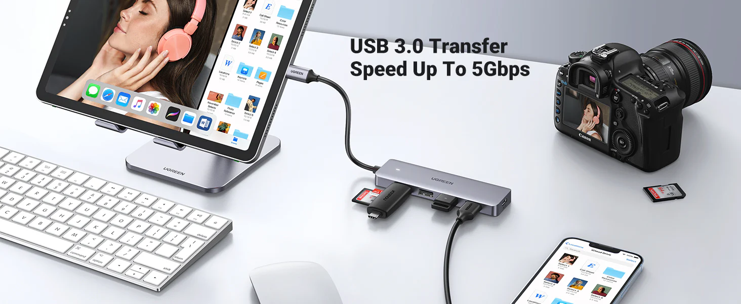 USB C data hub 4 Ports supports super faster data transfer up to 5Gbps – 10X faster than USB 2.0 (480 Mbps), which allows you to transfer HD movies or large files in just seconds.