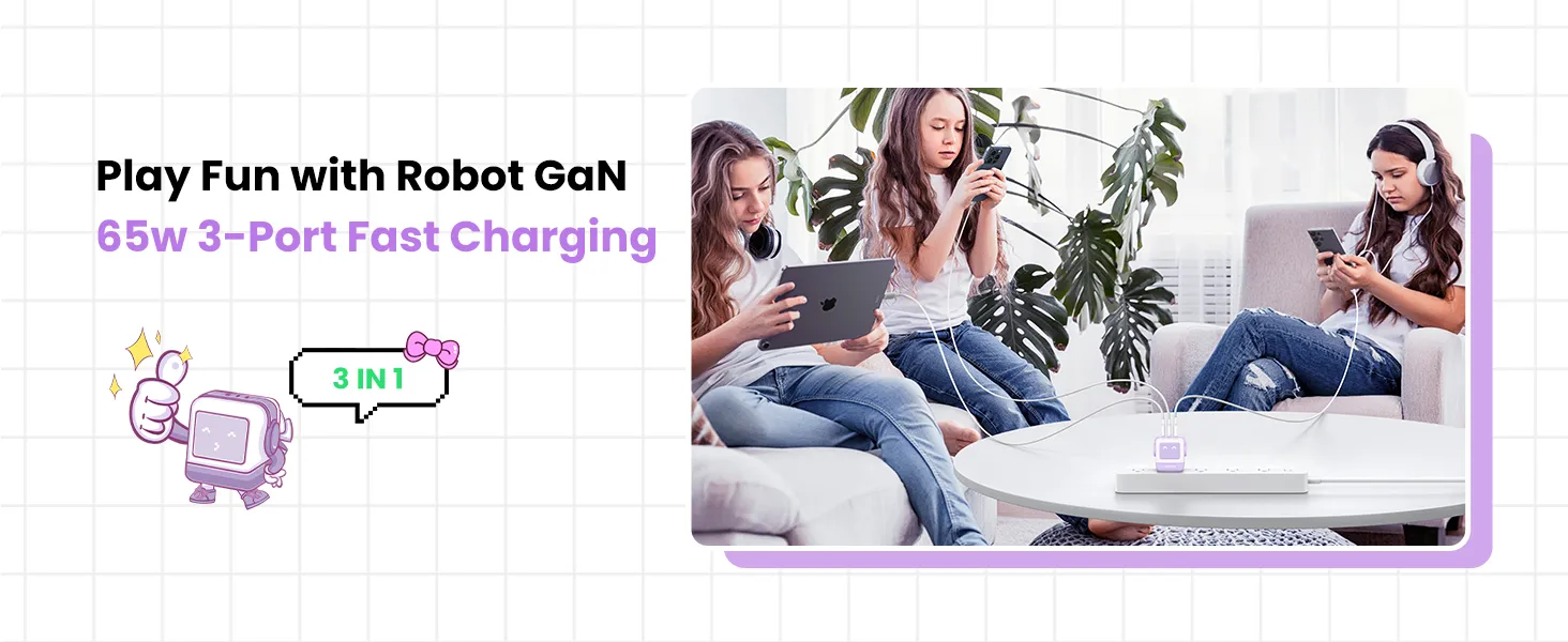 • RobotGaN Charger: Our cute 65W USB C charger combines functionality with playfulness.