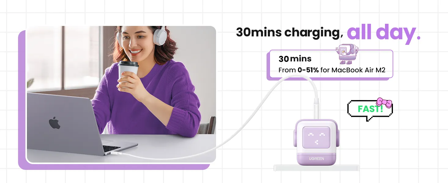 • Powerful 65W Charging: Charge MacBook Air M2 from 0 to 51% in 30 min with USB C.