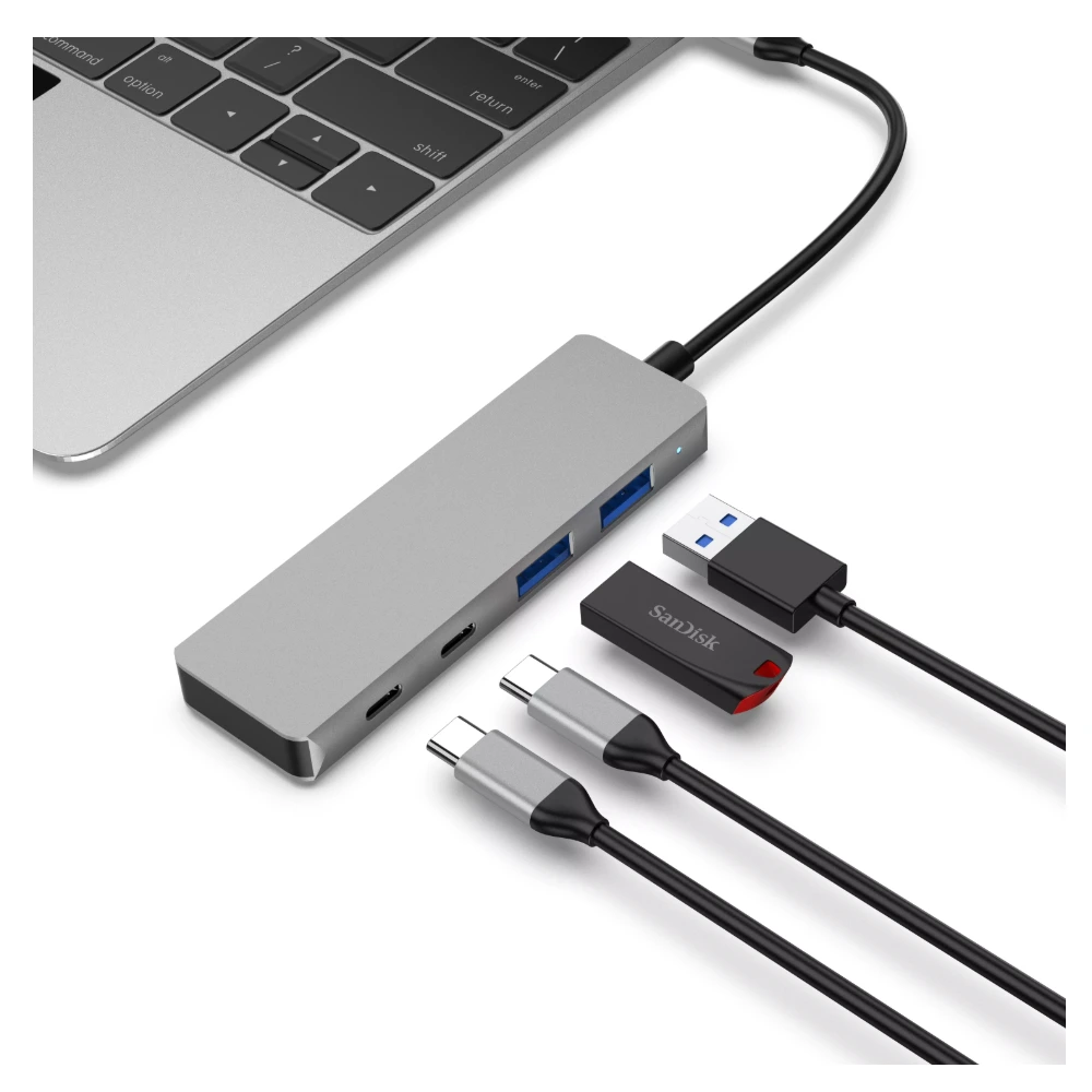 The 4 Port USB Hub expands your device connectivity with two USB-A 3.0 ports and two USB-C 3.0 ports, all supporting 5Gbps high-speed data transfer. Measuring just 6x4x1.2cm (50g), this ultra-compact hub fits in the palm of your hand, making it perfect for laptops and tablets with limited ports. Constructed with a durable ABS plastic housing and reinforced ports, it balances portability and longevity. Compatible with Windows 10+/macOS 11+/Chrome OS and Linux, it offers true plug-and-play functionality without driver installation. Whether you need to connect external drives, smartphones, tablets, or peripherals, this hub eliminates the hassle of constant plugging and unplugging.